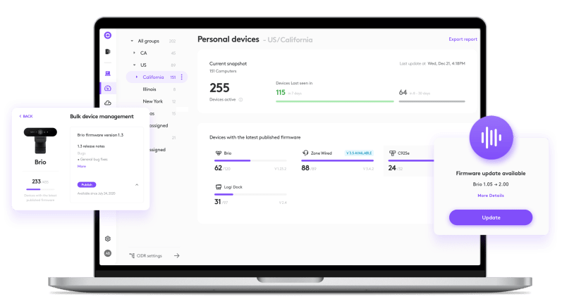無論員工是在辦公室、家中還是其他地方,Sync 裝置管理軟體都可以協助每個人保持聯繫,讓您確認其羅技視訊協作裝置健全運作且保持在最新狀態。