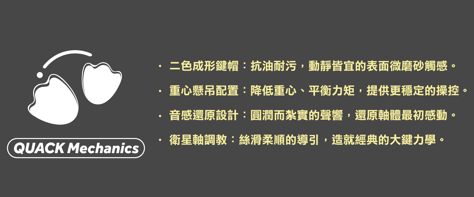 獨家QUACK Mechanics 鴨感力學,包含「音感還原」、 「重心懸吊配置」等機構設計,提供使用者圓潤的紮實手感,還原各軸體最初的感動,透過鍵盤本體上下多層次的堆疊,除了降低鍵盤重心外,平衡過後的力矩將提供使用者更為穩定的輸入環境,並導入全新獨家配方潤滑脂,對衛星軸進行出廠預潤調教