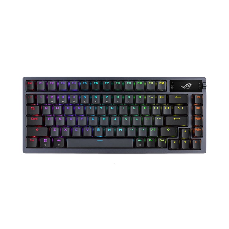 ROG Azoth 75%無線客製化電競機械鍵盤具備矽膠Gasket結構設計、三層消音泡綿和金屬上蓋、可客製熱插拔預潤 ROG NX 機械式鍵軸、ROG 鍵盤穩定器、PBT 二色成型鍵帽和潤滑套件、三模連線含 2.4 GHz SpeedNova 技術、OLED 顯示器、三向控制旋鈕、三種傾斜角度,並支援 Mac。