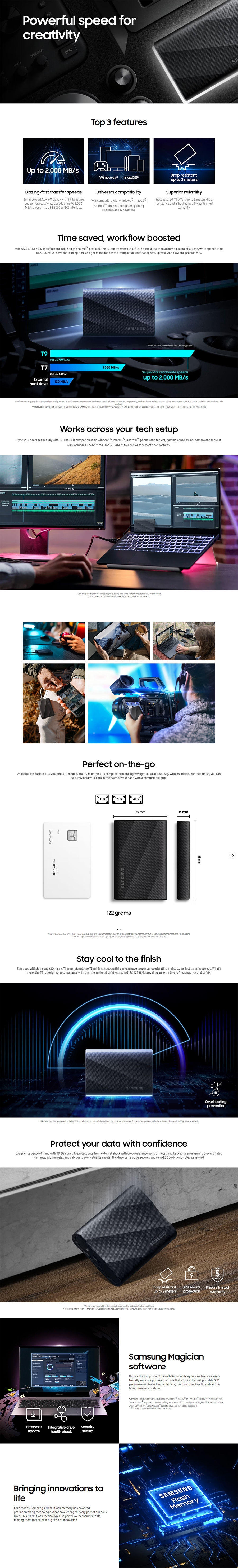 - T9 SSD 擁有 3m 防跌保護,並且能夠在攝氏 0 至 60 度正常運作,又提供 AES 256-bit 硬件加密保障。