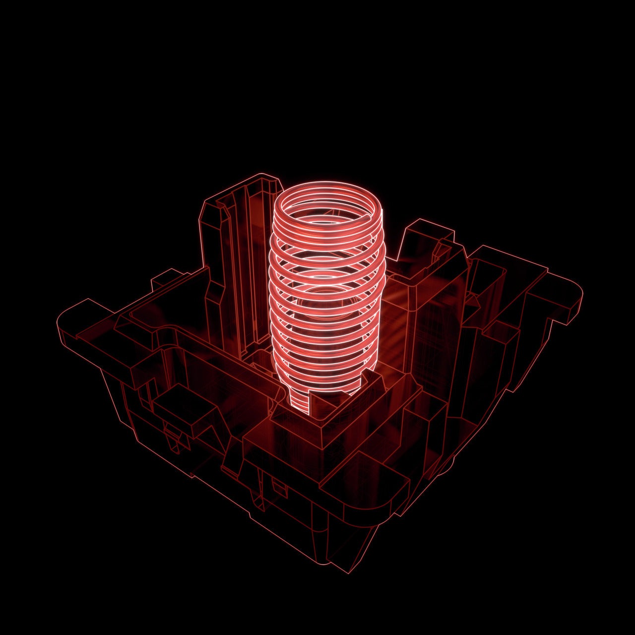 MX2A 開關不再使用圓柱形幾何彈簧,而是使用桶形彈簧,這種彈簧上下較窄,可確保每個彈簧在幾乎無接觸的線性運動中保持形狀。它還能減少內部劃痕,使每次按鍵都感覺均勻一致。