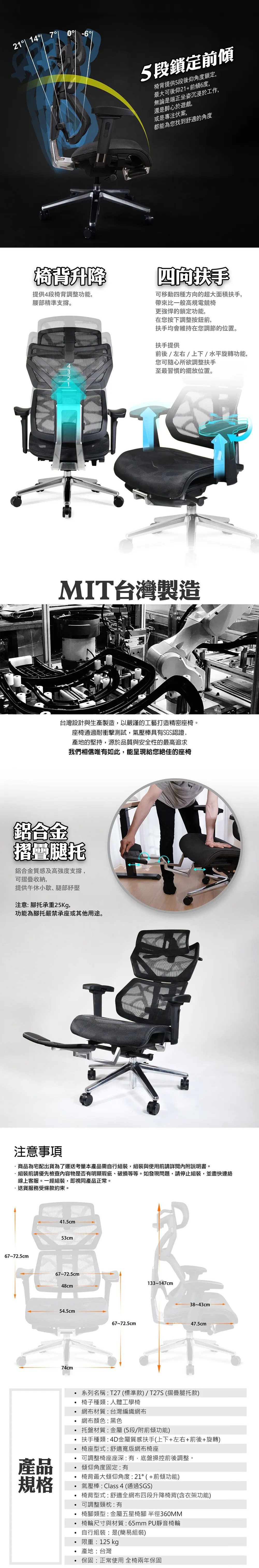 - 5 段鎖定前傾底盤,最大可後仰 21 度和前傾 6 度
