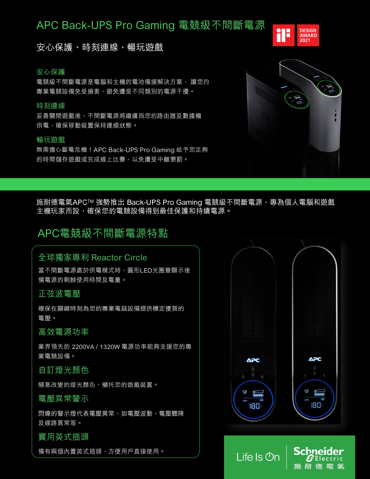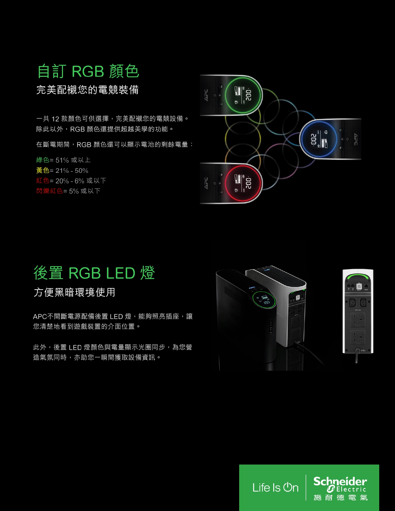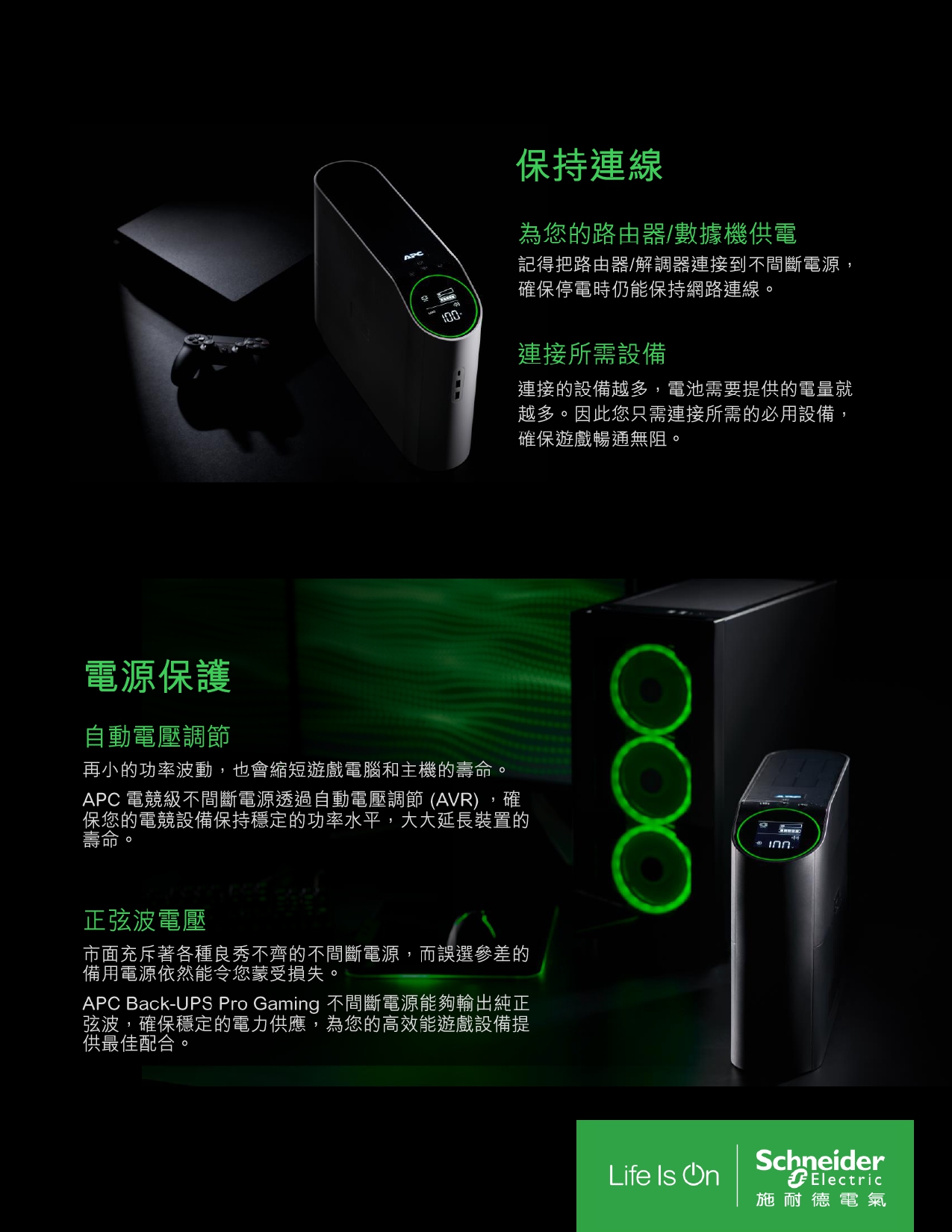 強大的 1320W/2200VA 不間斷電源能夠保護您的專業電競設備。後備電源及設有突波保護器的插座能讓你保持連線,而隨旁的三個 USB接口讓您輕鬆為裝置充電。