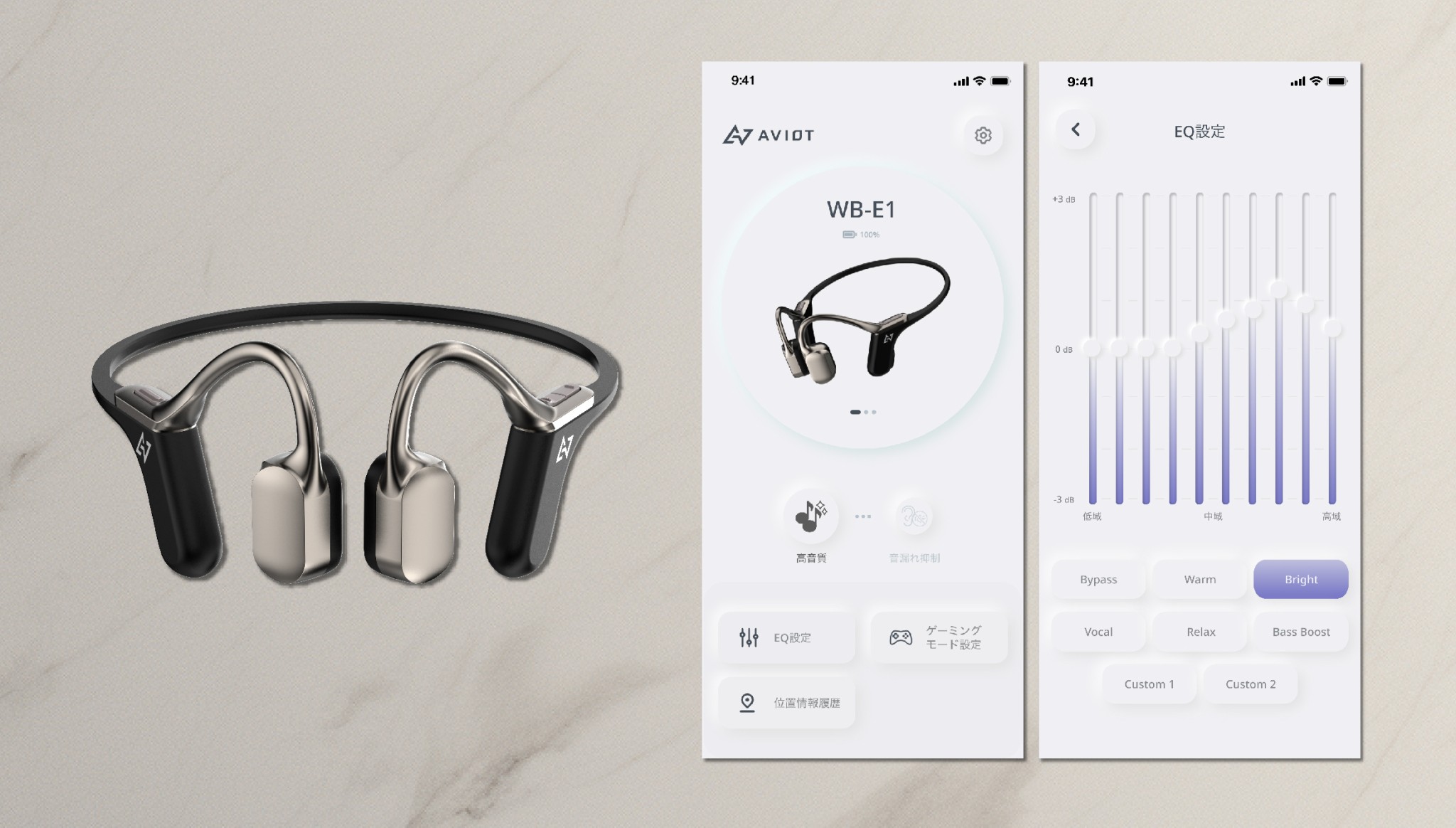 均衡器功能、遊戲(低延遲)模式設定以及 包括在高品質聲音模式和聲音洩漏抑制模式之間切換、 使用和享受 AVIOT 骨傳導耳機的方式範圍。