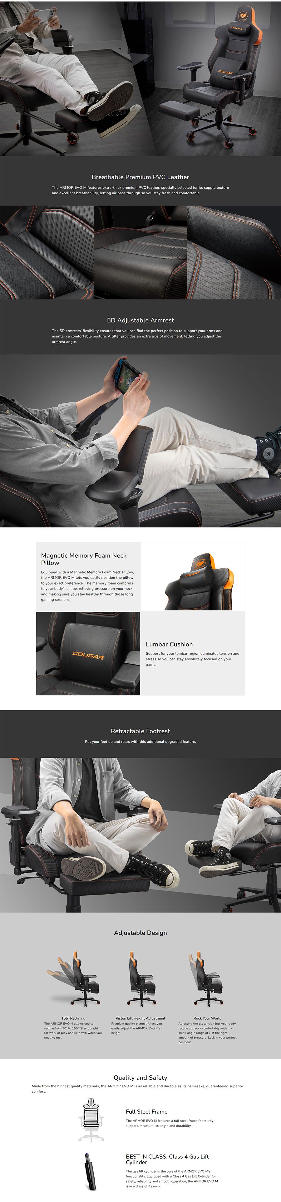 An evolution of the original ARMOR EVO, the ARMOR EVO M improves on its predecessor with additional enhancements, including 5D adjustable armrests with an extra axis of movement and a retractable footrest.