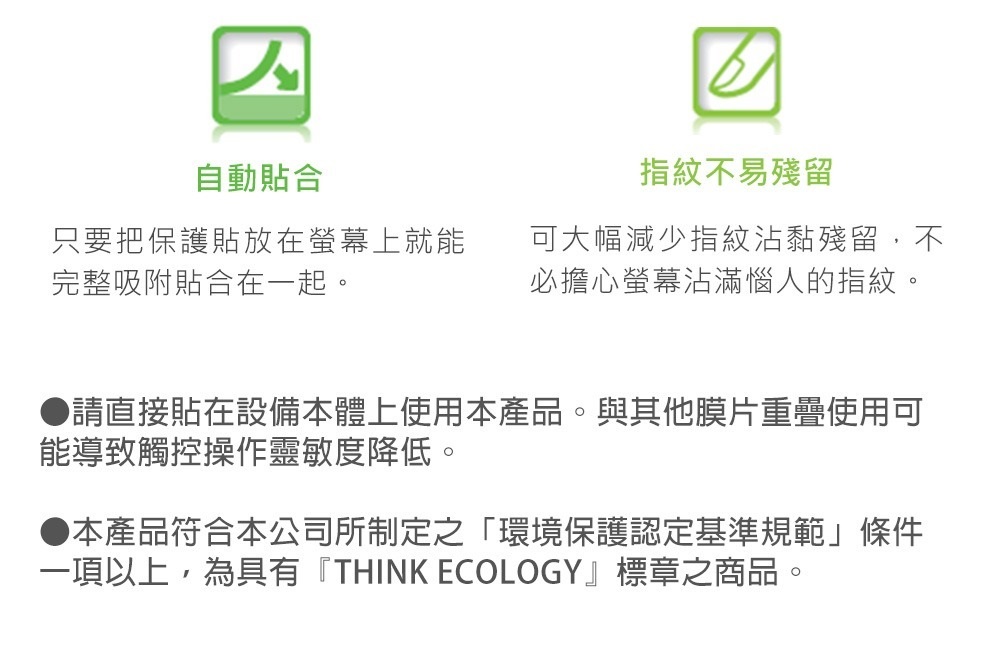 - •可大幅減少指紋沾黏殘留,不必擔心螢幕沾滿惱人的指紋。