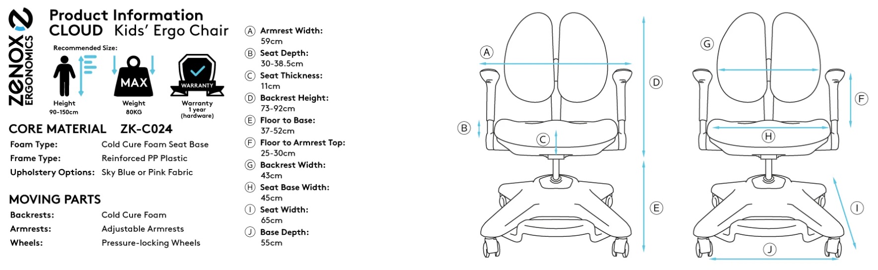 | MaterialSKU: ZK-C024 Warranty: 1-Year (Hardware) Frame Material: Reinforced PP Plastic Upholstery: Fabric Backrest Pillow: Cold Cure Foam Armrests: Adjustable Armrests Wheels: Pressure-locking Wheels Color Options: Pink / Sky Blue | DimensionsArmrest Width: 59cm Seat Depth: 30-38.5cm Seat Thickness: 11cm Backrest Height: 73-92cm Floor to Base: 37-52cm Floor to Armrest top: 25-30cm Backrest Width: 43cm Seat Base Width: 65cm Base Depth: 55cm | Package InfoPackage Size: 78cm x 58cm x 49cmNet Weight: 21.1kg