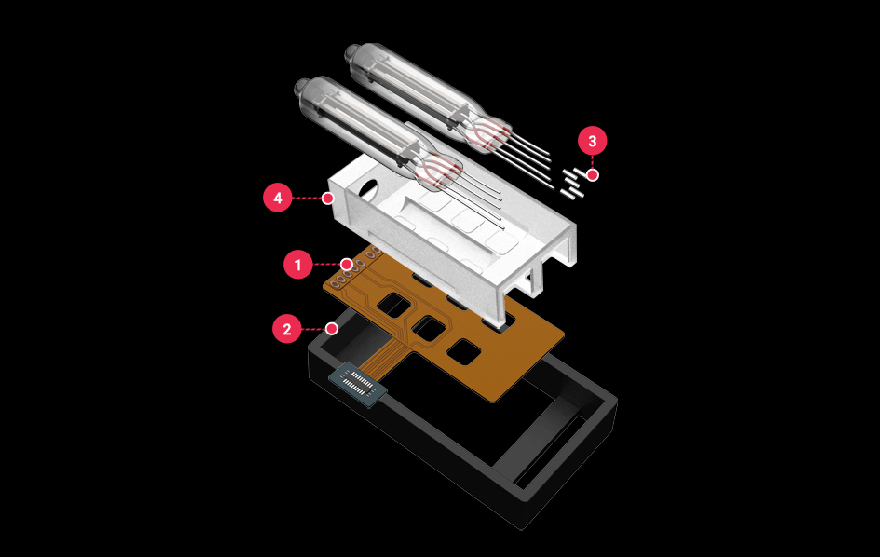 專屬真空管抑振系統 隔絕顫噪效應 在便攜播放器的設計與領域中,真空管的應用一直諸多挑戰,特別是在確保設備的整體耐用性和音質純淨度方面,這是由於在便攜設備中使用真空管容易受到機身搖晃或碰撞的影響,進而產生顫噪效應(Microphonic Effect)。這最終導致在輸出放大中容易引發噪音和失真,不僅影響音色的最終表現,還可能縮短真空管的壽命,並對播放器的結構造成損害。此外,真空管若安裝於電路板(PCB)上,其附近的集成電路可能會導致干擾和底噪,增加背景噪聲,且損失音樂細節。