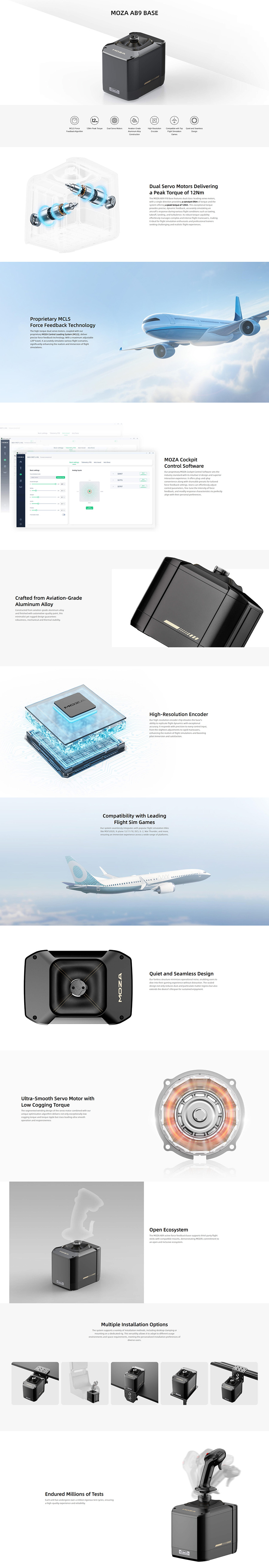 - MOZA AB9 底座配備雙伺服電機,峰值扭矩為 12Nm,可提供精確的動態反饋,模擬滑行、起飛、著陸和湍流等各種飛行條件。