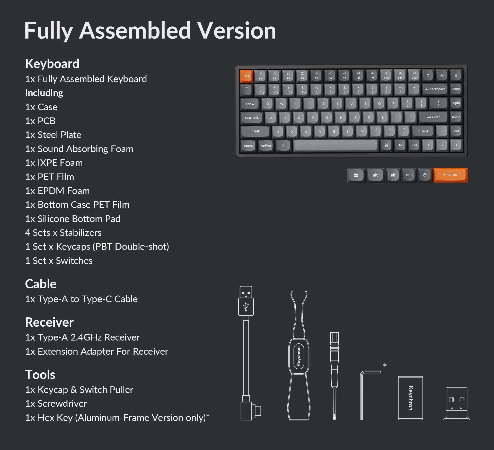 SPECIFICATIONNumber of Keys: 84 (75%) Switches: Keychron Super mechanical Switch Face: South-facing Number of Multimedia Keys: 12 Frame Material: ABS / ABS+Aluminum frame Keycap Material: Double-shot PBT Keycap Profile: OSA (OEM profile with spherical-angle) Layout: ANSI Polling Rate (2.4GHz and Wired Mode): 1000Hz Polling Rate (BT Mode): 90Hz N-Key Rollover (NKRO): Yes for both wireless and wired modes |