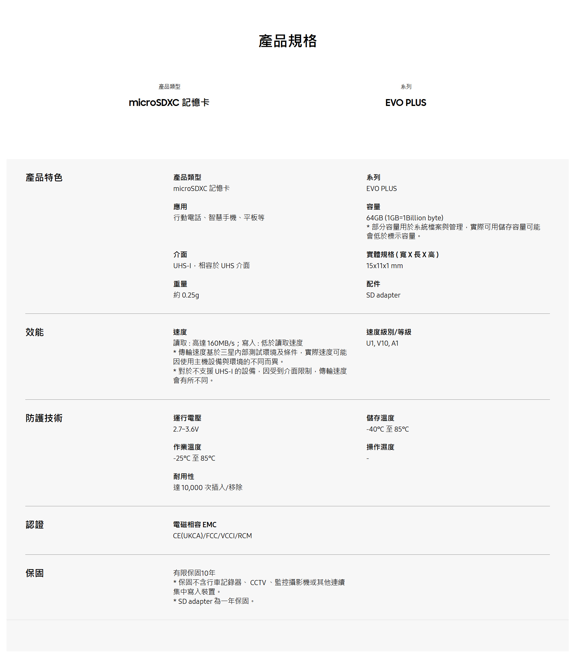 【10年保用】Samsung 三星 EVO Plus 160MB/s U1 V10 A1 Micro-SD(請保留包裝, 以便日後保養)