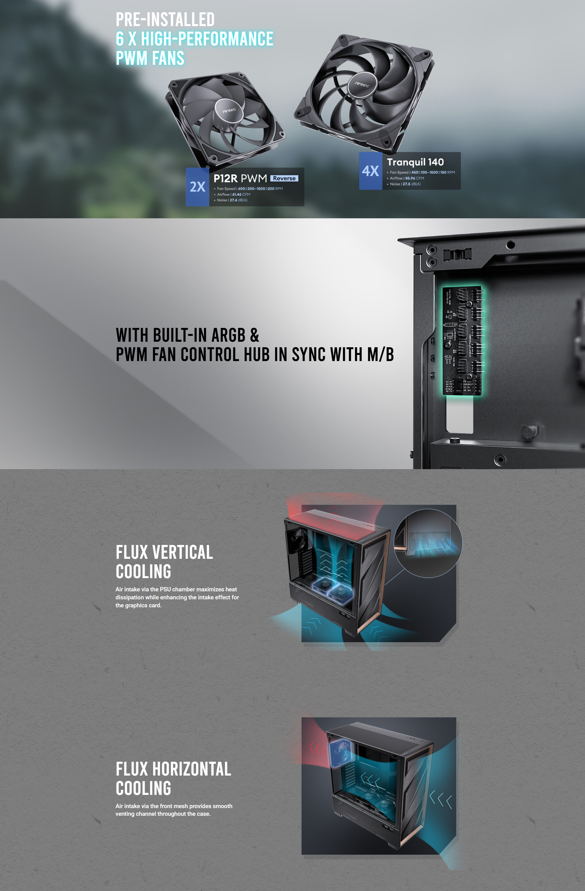 3 x 140mm Tranquil PWM fans in front + 2 x 120mm P12R PWM reverse fans on PSU shroud