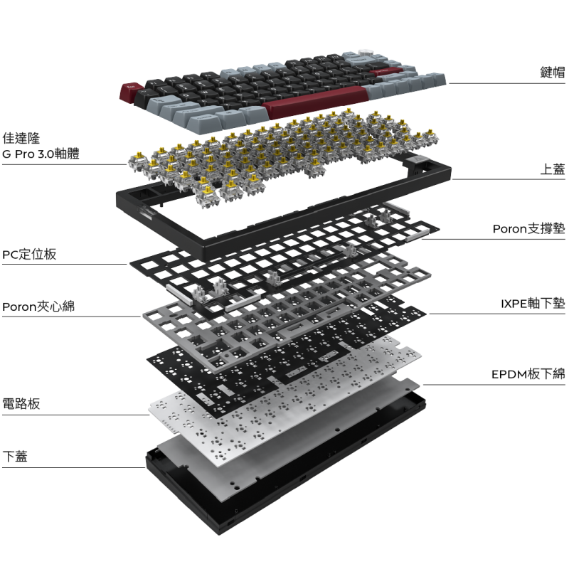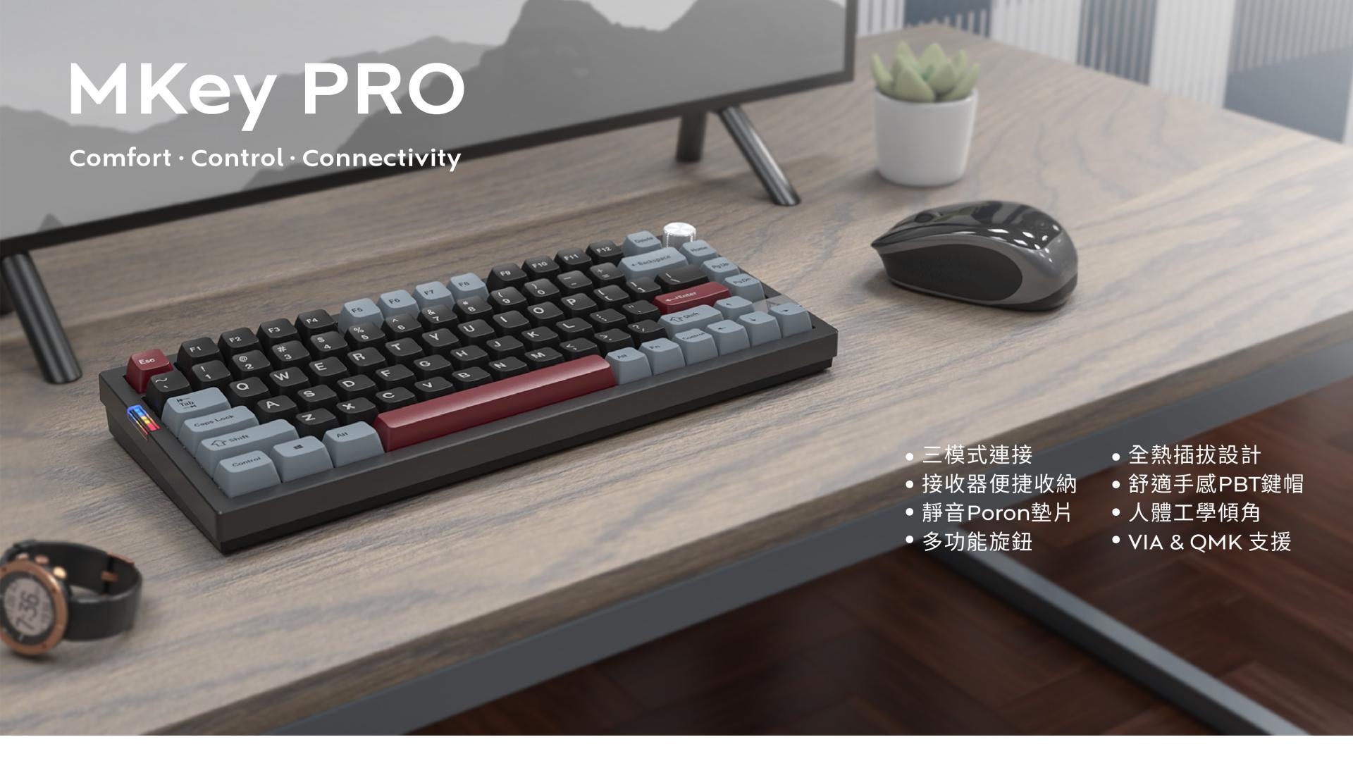 - MKey PRO 採用先進的墊圈安裝設計,搭配可熱插拔的 Gateron G Pro 3.0 軸體,不僅提供安靜、舒適且穩定的流暢手感,更能隨心定制鍵盤性能,量身打造您的專屬使用體驗。