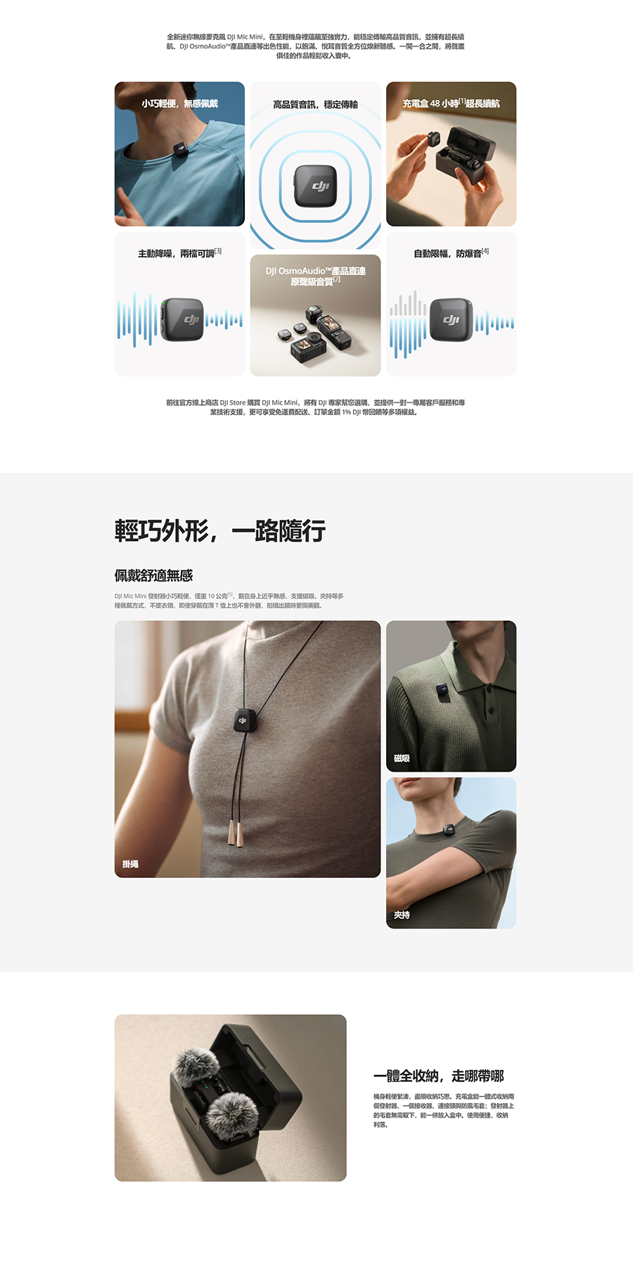 使用 DJI Mic Mini(一發一收),未開啟降噪功能,在無干擾環境下近距離收音,發射器與接收器連接,且接收器用 3.5 公釐線連接相機時測得。