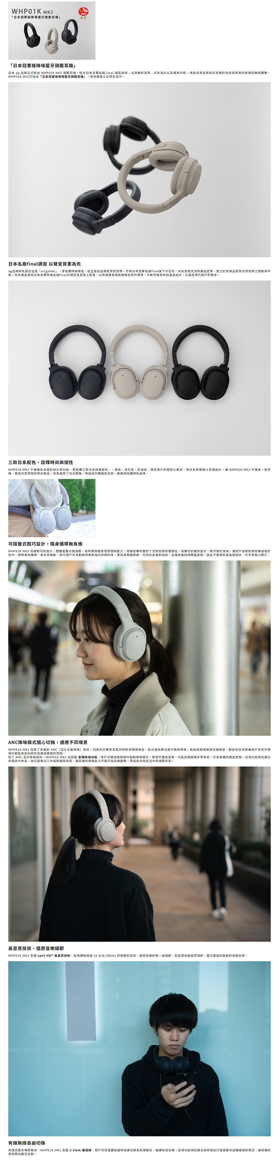- WHP01K MK2 頭戴耳機,結合日本音響名廠 final 調音技術,以高解析音質、日系設計以及卓越的ANC降噪功能,作為第二代更兼俱aptx HD音質和穩定性更高,為追求高音質與日常便利性的用家提供舒適的聽感體驗。