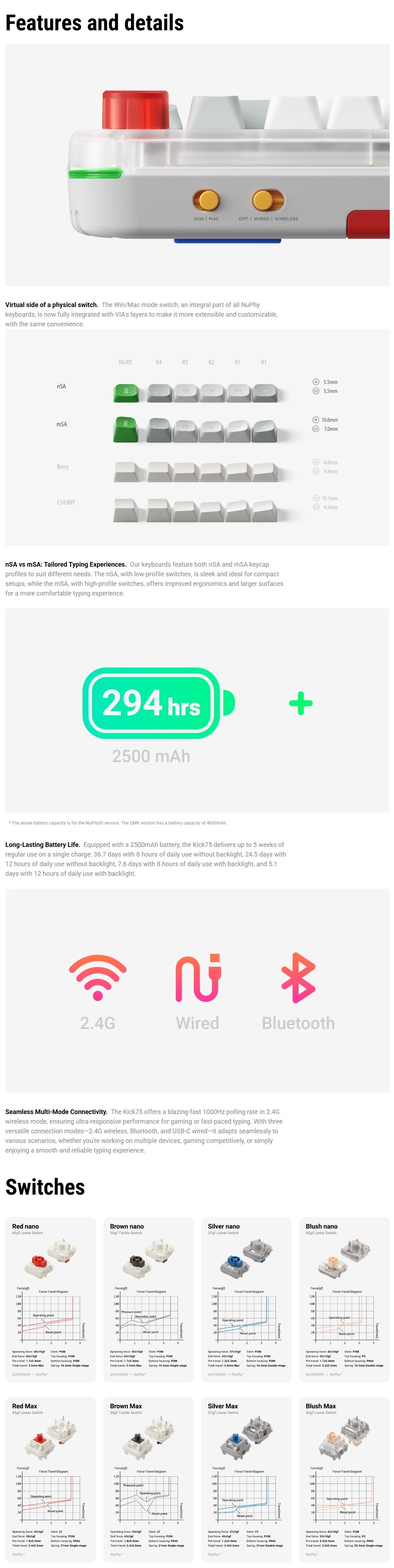 This is a whole new species that sails through your work and play. As the world’s first keyboard with a high-low compatible design, it delivers a seamless switch experience between high-low profile switches. The Nano and Max switches provide an exceptional typing feel with smoothness and satisfying sound. With Bluetooth and 2.4G connectivity, it maximizes work efficiency while being fully capable for gaming. You can express yourself and get things done effortlessly with Kick75.