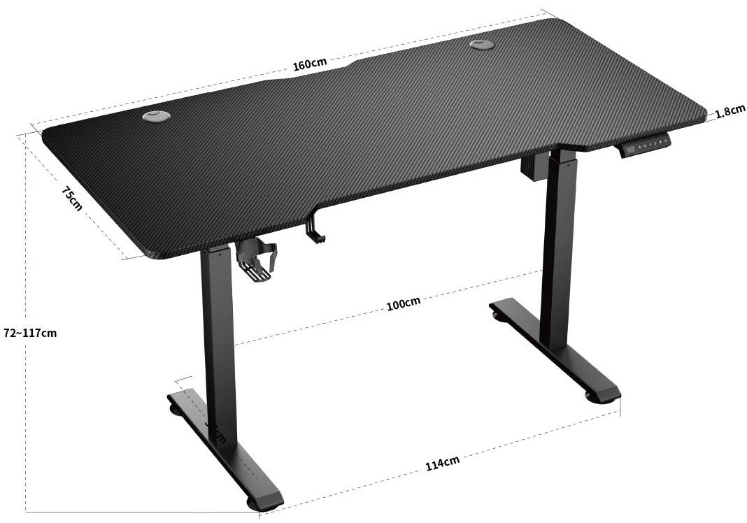 - 高度可調範圍為 72-117 厘米,配有電動升降裝置