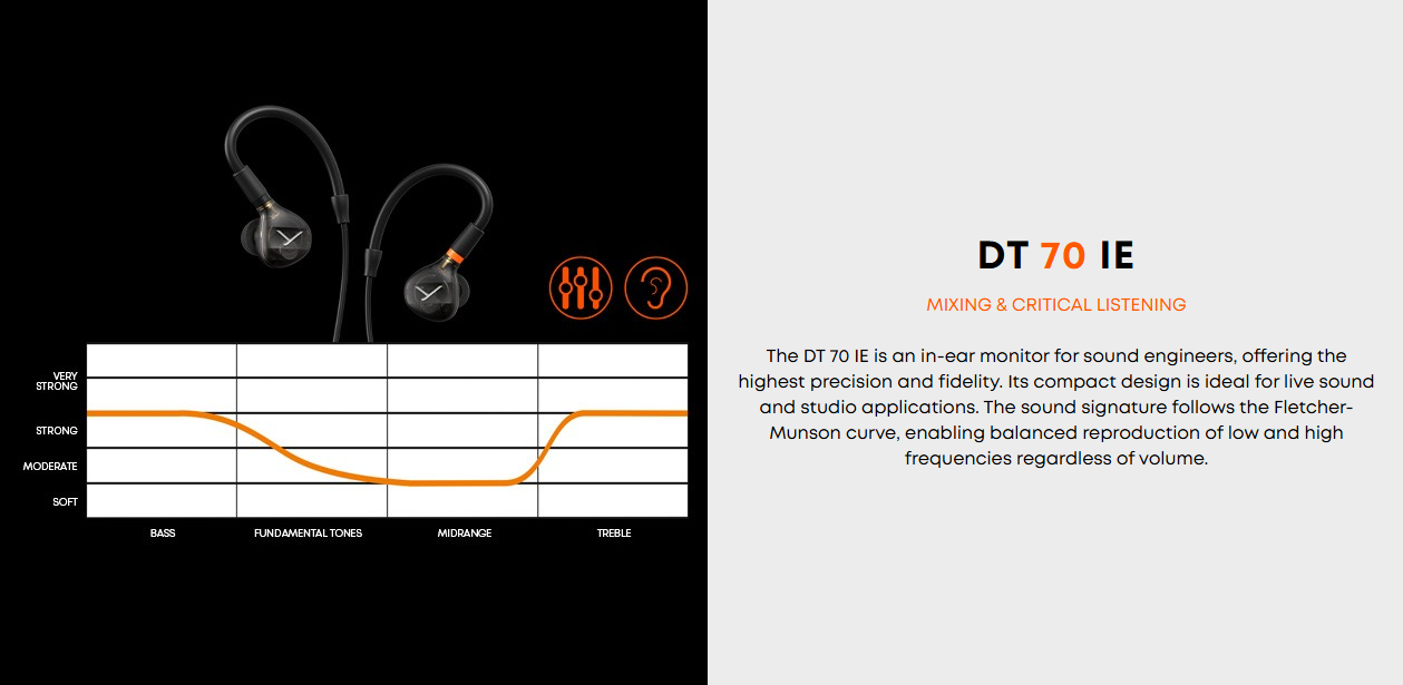 - DT 70 IE:適合混音和精確聆聽,具備線性音質,無論音量大小都能呈現平衡的音效。