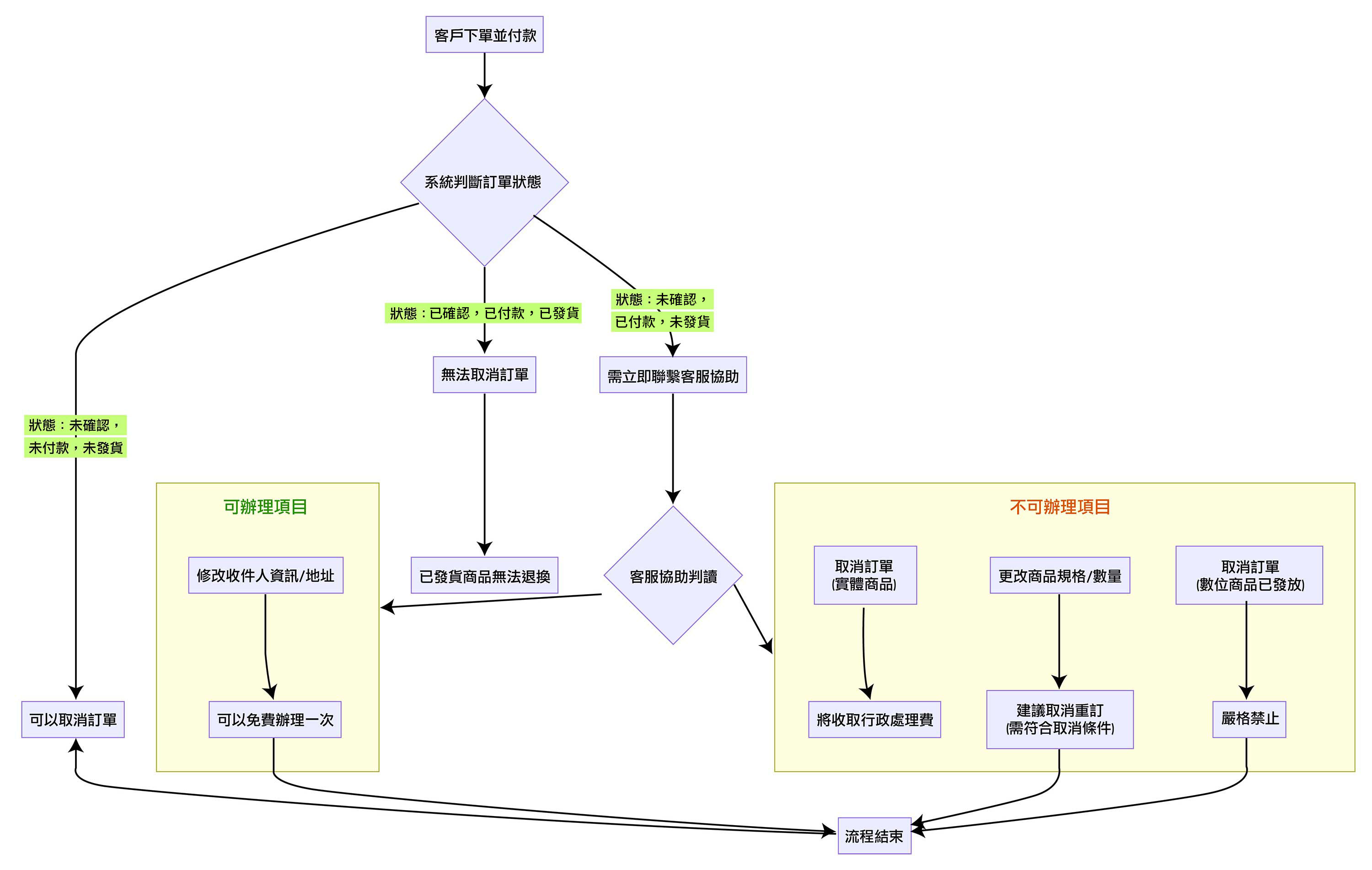 - 3.1. 訂單一經成立,即進入我們的系統處理流程。能否修改或取消,取決於訂單的當前狀態;