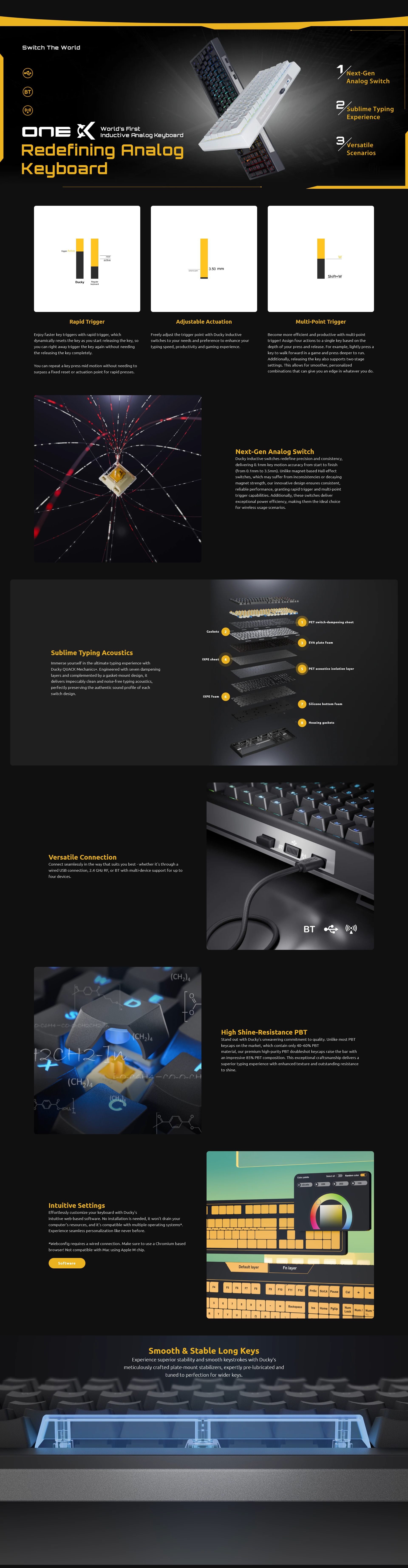 Introducing the Ducky One X, a tri-mode wireless mechanical keyboard equipped with next-gen analog switches! Featuring Ducky inductive switches that support rapid trigger and multi-point trigger, a gasket-mount design, and tri-mode connectivity options, this keyboard sets a new standard for versatility. With Ducky QUACK Mechanics+ incorporating seven dampening layers, coupled with 85% high-purity PBT doubleshot keycaps, every keystroke delivers an unparalleled experience. Make it your own by customizing it with our intuitive web-based configuration software. Take your typing experience to the next level with the Ducky One X!
