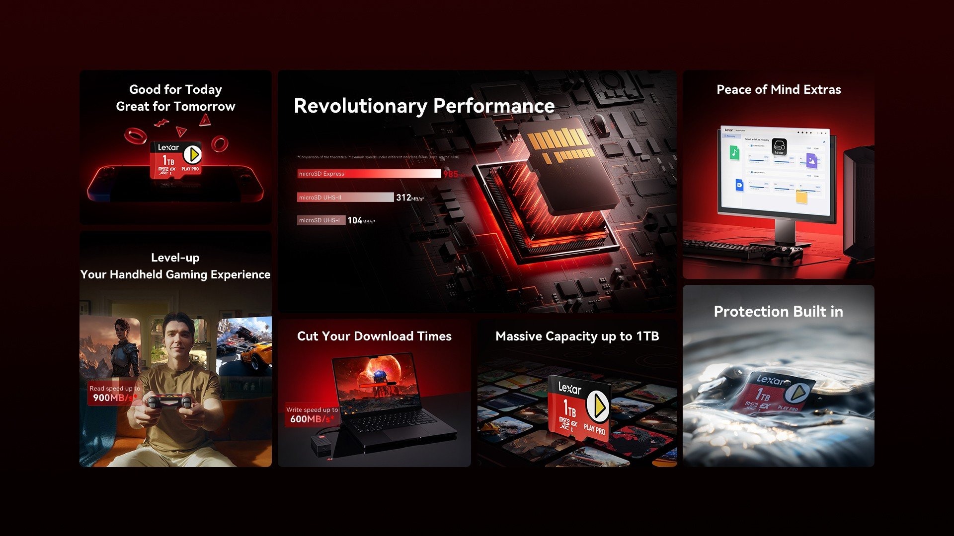 Lexar PLAY PRO microSDXC™ Express Card 為玩家提供史詩級的效能提升,讀取速度高達 900MB/s,寫入速度高達 600MB/s ,容量高達 1TB,可為許多 AAA 遊戲提供空間。