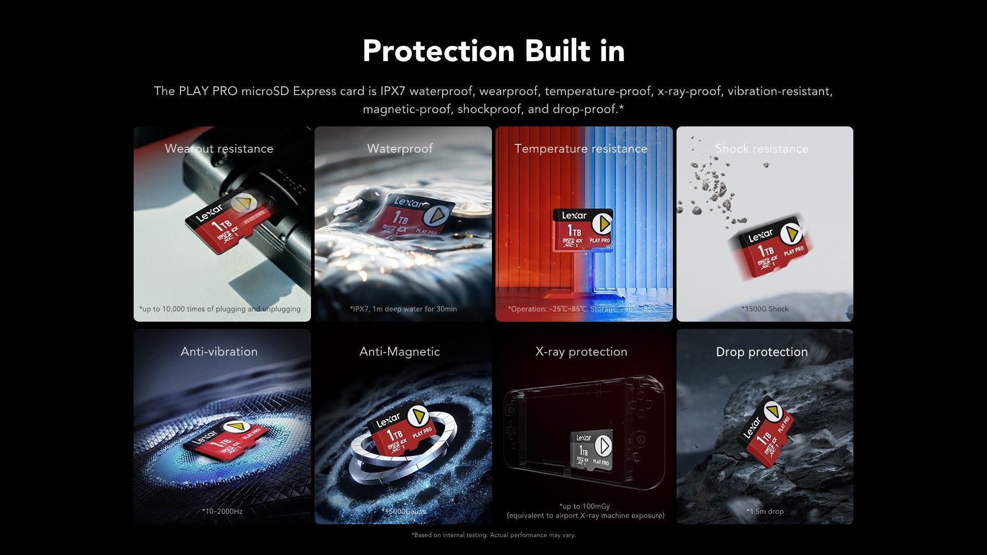 PLAY PRO microSD Express 卡具有 IPX7 防水、防磨損、防高溫、防射線、防振動、防磁、防衝擊和防摔功能。3