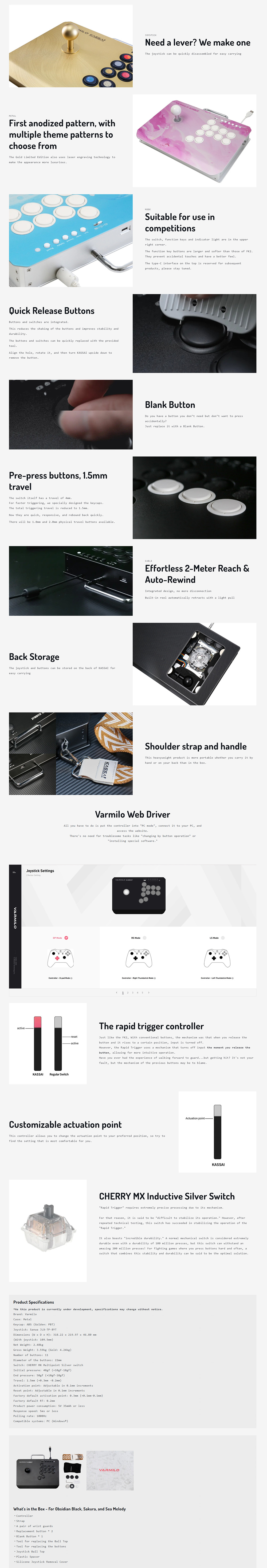Kassai 是 Varmilo 推出的格鬥遊戲控制器,專為競技玩家設計,結合品牌標誌性的精湛工藝與創新技術,提供卓越的遊戲體驗。