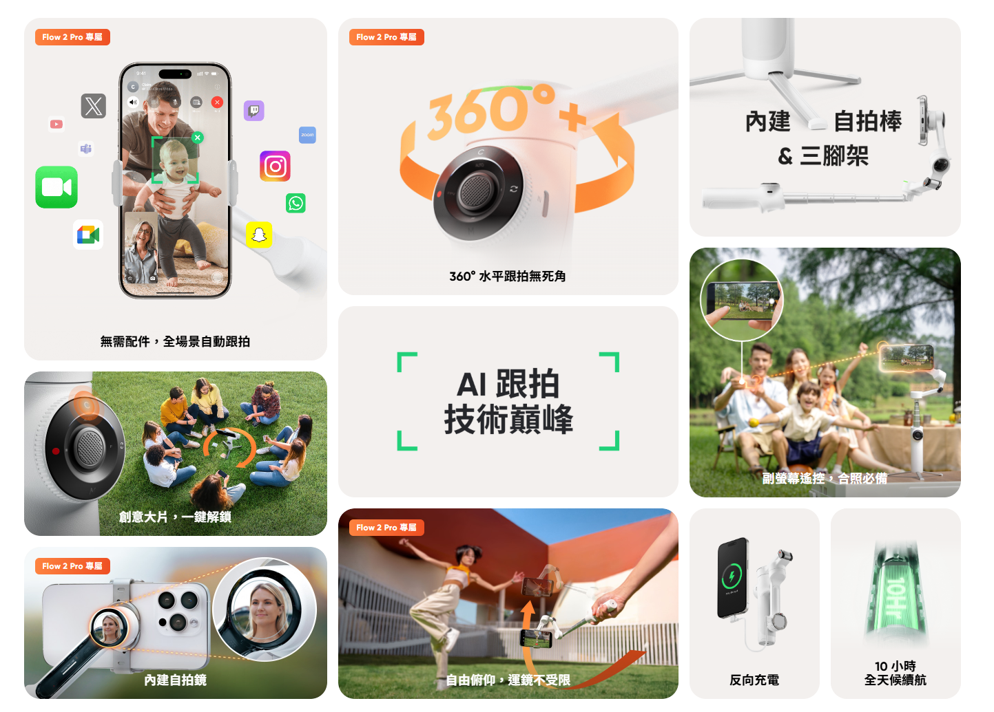 Flow 2 Pro 穩定器主體: 約 357g 手機夾: 約 25g Flow 2 Plus 穩定器主體: 約 348g 手機夾: 約 25g AI 追蹤模組: 約 14g