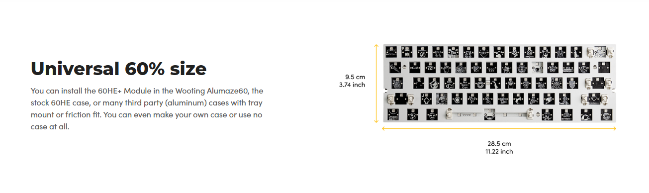 • 通用60%尺寸:相容Wooting Alumaze60、原裝60HE外殼或第三方托盤安裝/摩擦固定外殼,可自製外殼或無外殼使用。