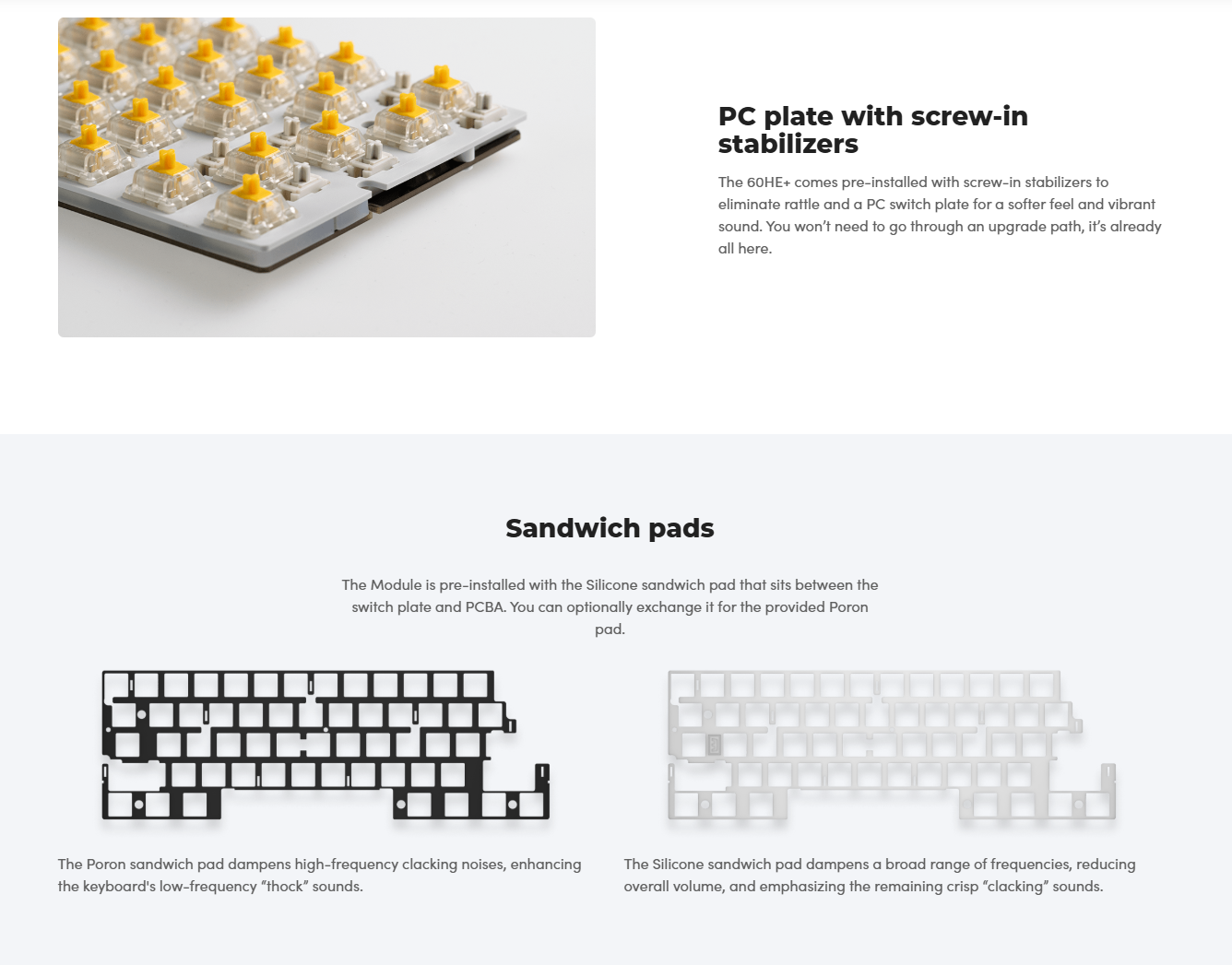 • 矽膠/Poron襯墊:預裝矽膠襯墊,降低廣泛頻率噪音,強調清脆「clacking」聲;可選Poron襯墊,減弱高頻噪音,增強低頻「thock」聲。