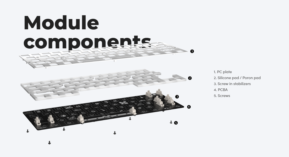 • PC開關板與螺絲固定穩定器:預裝聚碳酸酯(PC)開關板,提供柔軟手感與鮮明「thock」聲,螺絲固定穩定器消除晃動聲。