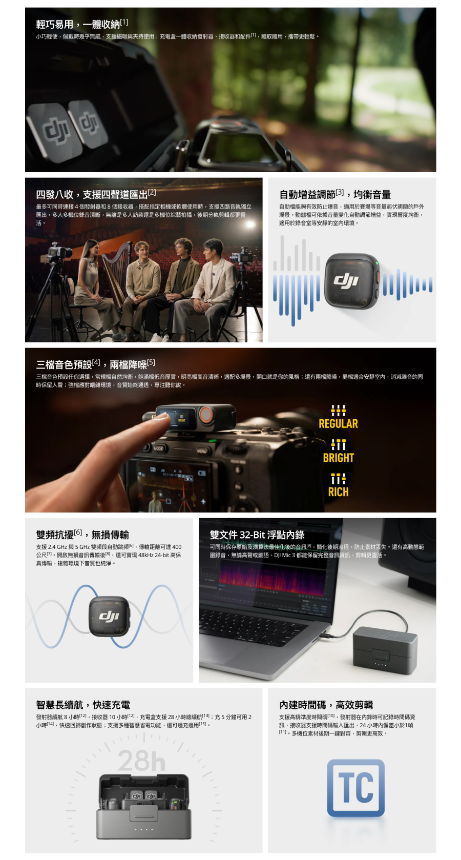 使用 DJI Mic 3(兩發一收,含充電盒),未開啟降噪和內錄等功能,在無干擾環境下近距離收音,兩個發射器均與接收器連線,且接收器透過 3.5 公釐線連接相機時測得。