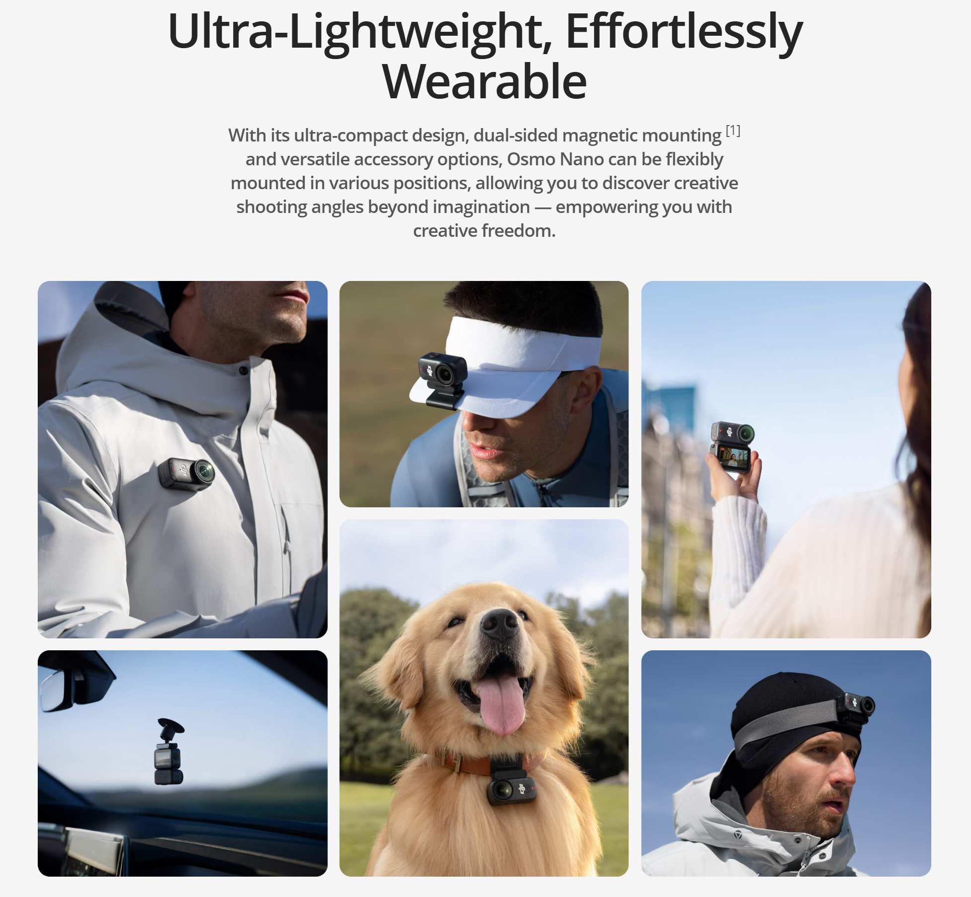Osmo Nano 輕巧便攜,隨時待命,讓你在日常與旅途中輕鬆捕捉生活瞬間; 不論騎行、跑步、史詩級冒險或日常片段,都能拍出清晰鮮活的畫面,讓每段回憶栩栩如生。 其俐落的磁吸式設計,解鎖大膽的免持拍攝角度,以全新方式訴說你的故事。