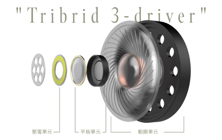 三單元: 1 組壓電式(Piezo)驅動單元、1 組平板單元、1 組動圈單元