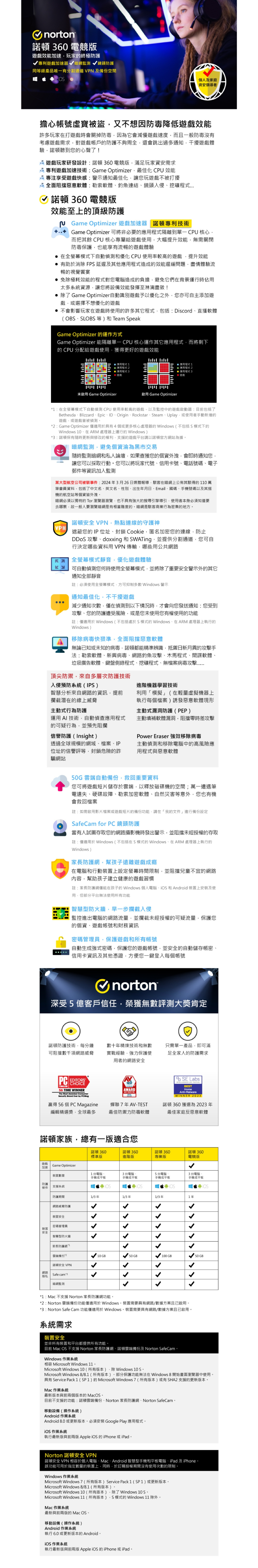 Game Optimizer / Dark Web Monitoring / 以安全VPN保護線上私隱權 / 個人電腦通知最佳化 / 保護你免受挖礦劫持及技術支援詐騙 / 病毒、惡意軟體、間諜軟體及勒索軟體防護
