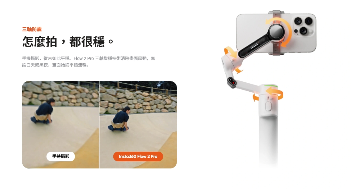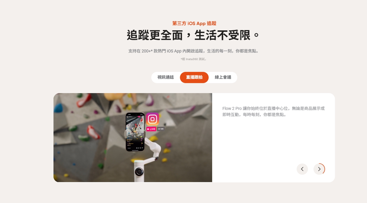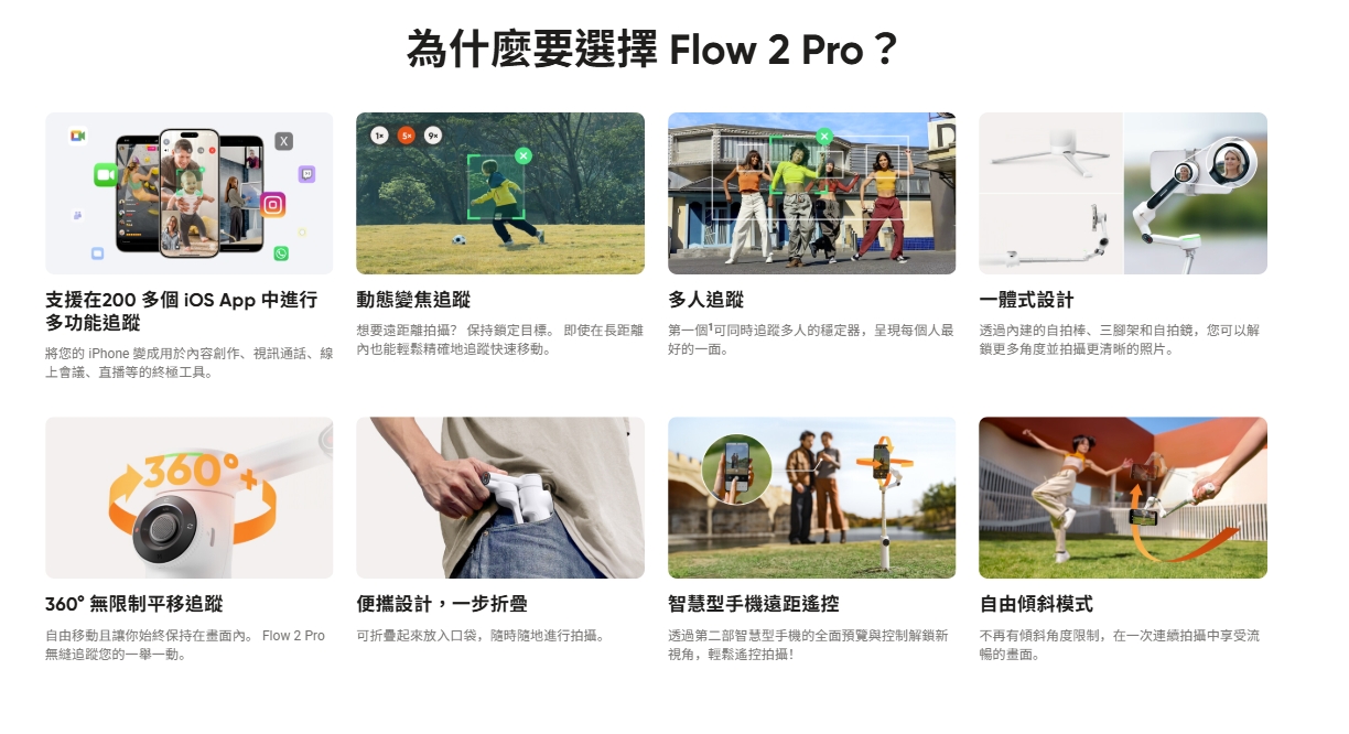 - 自由移動且讓你始終保持在畫面內。 Flow 2 Pro 無縫追蹤您的一舉一動。