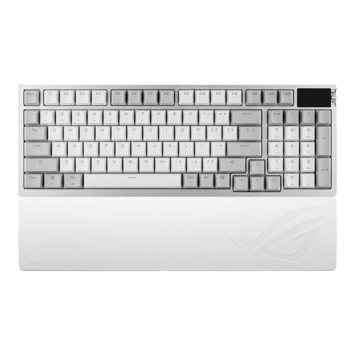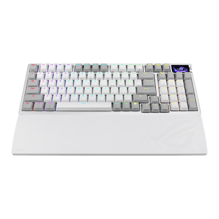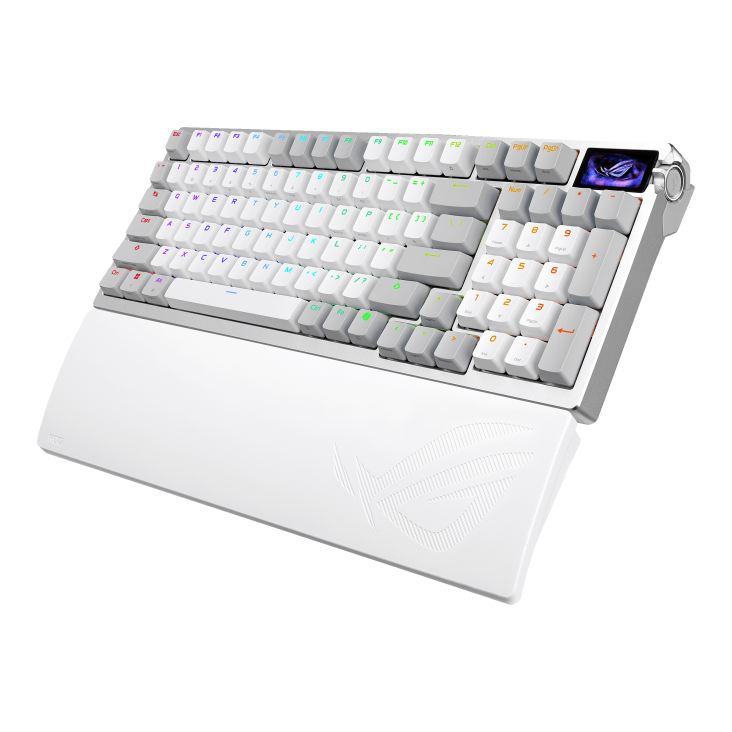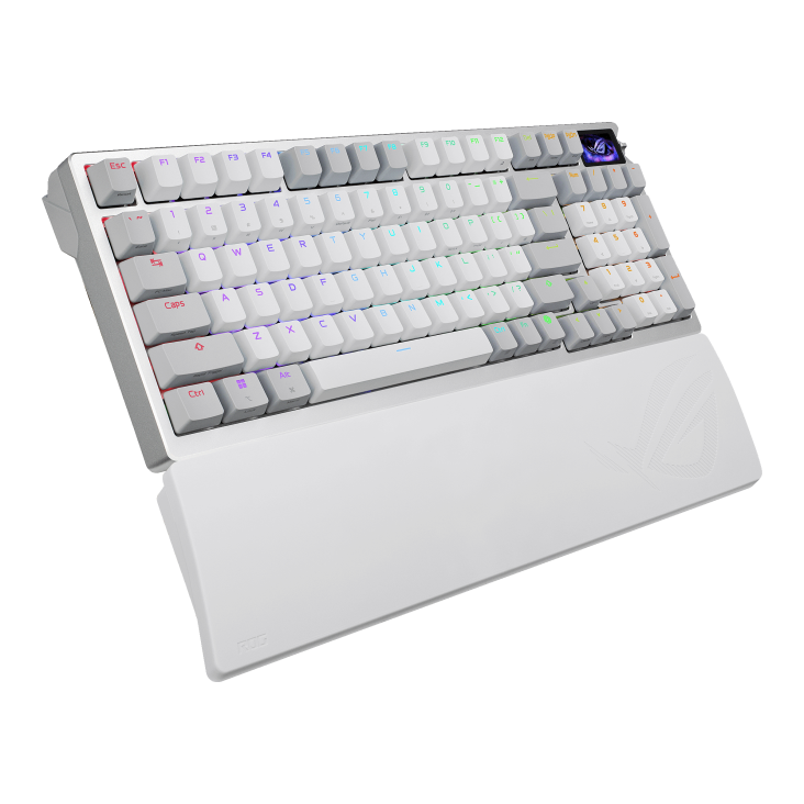 ROG Azoth 96 HE 類比遊戲鍵盤,配備可熱插拔 ROG HFX V2 磁性開關及 ROG 霍爾感測器;具備 OLED 顯示螢幕、三向旋鈕、三模連接支援 ROG SpeedNova 8K 無線技術、區域模式、六層減震設計以及可拆卸矽膠手腕托。