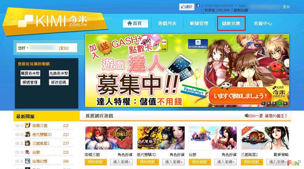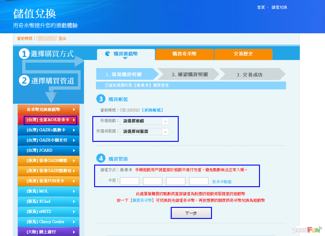 2. 選擇「台灣全家族OK奇米卡」→ 選擇遊戲及伺服器→輸入奇米卡密碼→下一步