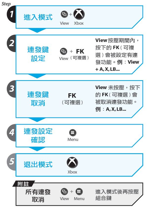 可設定連發按鍵(Turbo, 此功能於Xbox one平台上不支援):A、B、X、Y、LB、RB、LT、RT、LTSB、RTSB、按板 (1、2、3、4)共14 顆按鍵( 以下稱為FK