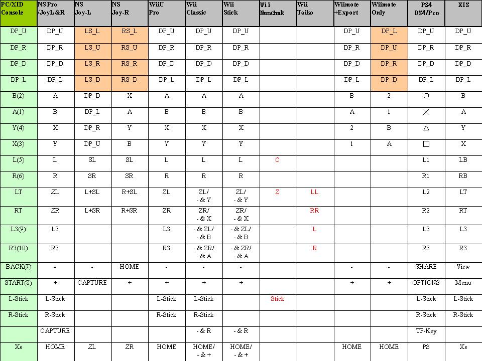 對應PC_XID的轉接器按鍵配置對應表如下: