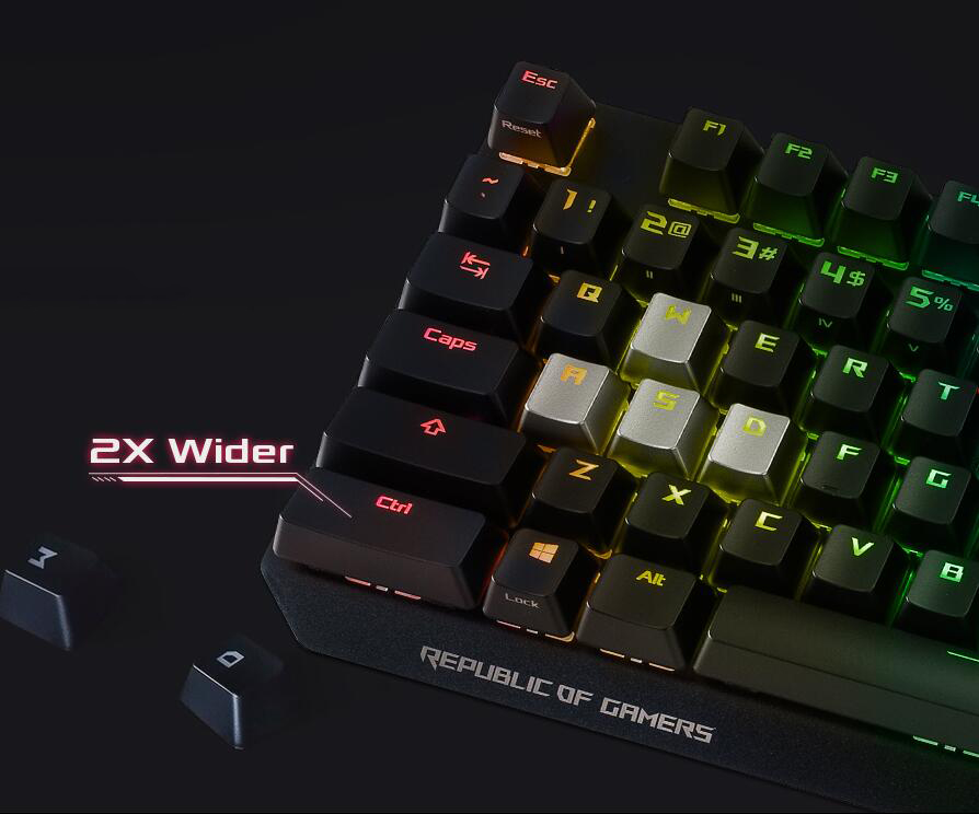 世界一流的 ROG 研發團隊仔細研究 FPS 遊戲玩家的遊戲風格,根據研究結果打造出較傳統 Ctrl 按鍵大兩倍以上的按鍵。Xccurate 設計從此誕生:超寬 Ctrl 鍵可降低按錯鍵的機率,達到更高的精準度。此款鍵盤隨附四個銀色鍵帽,使用者可輕易識別 WASD 按鍵群,甚至附帶鍵帽拔鍵工具以輕鬆進行自訂。