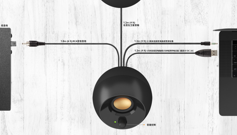 - 線材長度:右到左衛星音箱 1.2m音頻線,線性輸入 1.2m 3.5mm 立體聲音頻線,DC電源 1.2m USB Type A線纜,低音炮 1.8m 標準RCA插頭的音頻線