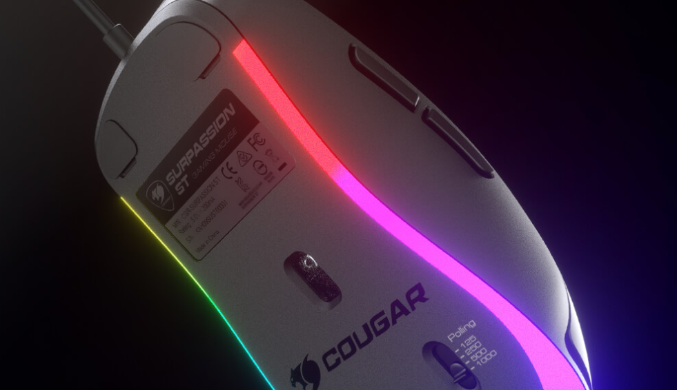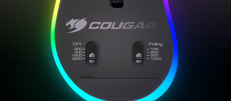 在Surpassion ST下方,兩個方便的開關可讓您選擇您喜歡的DPI級別(800/400/1600/3200)和輪詢率(125/250/500/1000)。