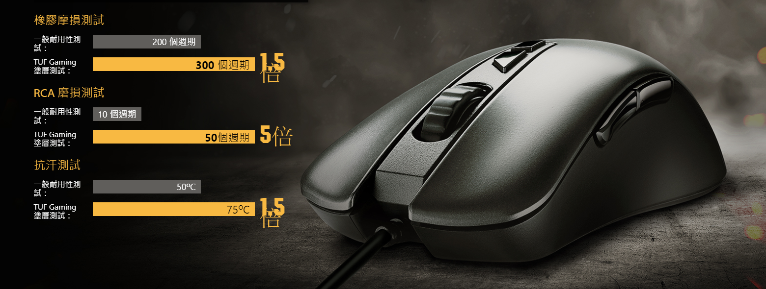 - 通過堅固性認證,並以專業塗層提高耐用性,採用可點擊 2000 萬次的開關及 Teflon 材質滑鼠腳,移動距離最長可達 250 公里。