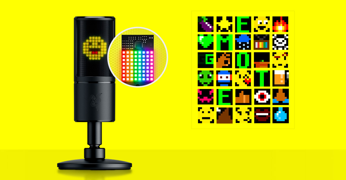 與其他直播 USB 麥克風不同,Razer Seiren Emote 搭載採用我們表情符號引擎技術的 8 位元表情符號 LED 顯示屏,包含超過 100 種動態與靜態表情符號。