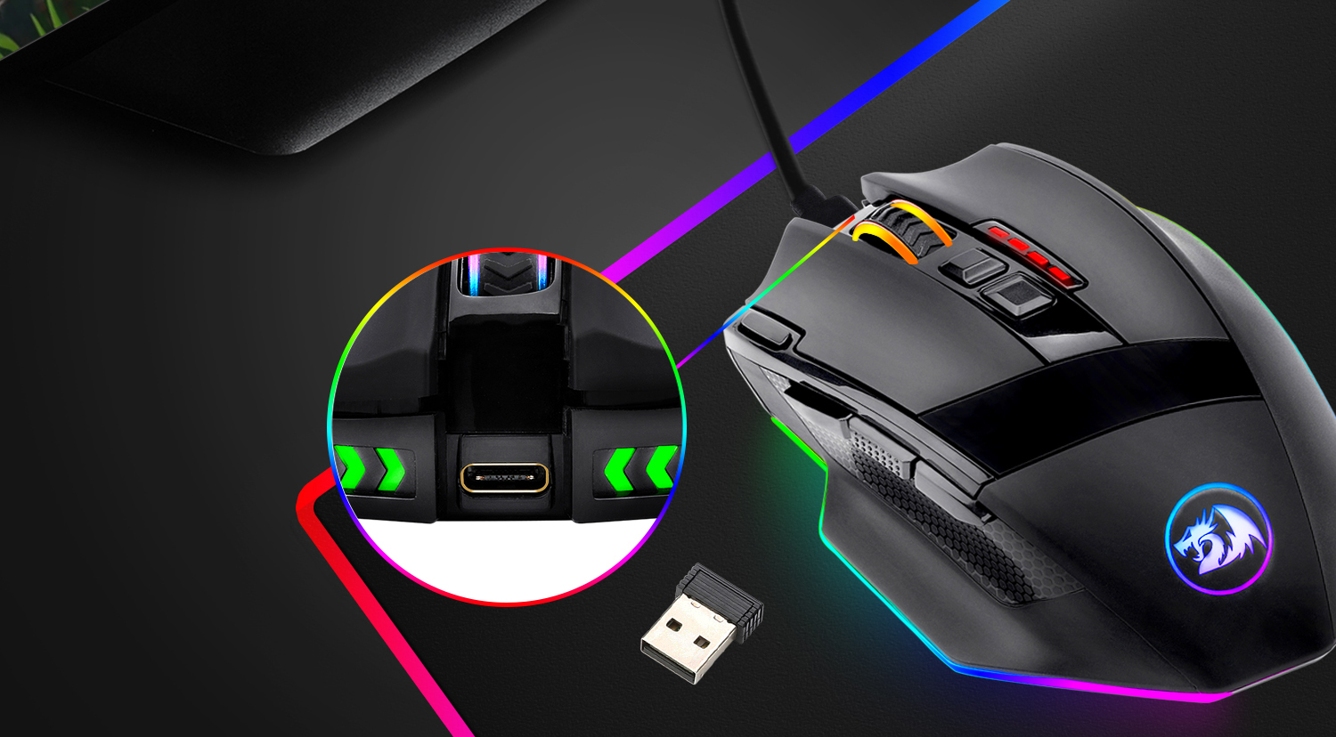 Support wireless (via includedd USB receiver), or wired (via included USB type-C cable) connectivity. Use the included USB type C cable to charge the inbuilt rechargeable lithium ion battery. On a full charge, the mouse runs wirelessly for up to 35 hours.
