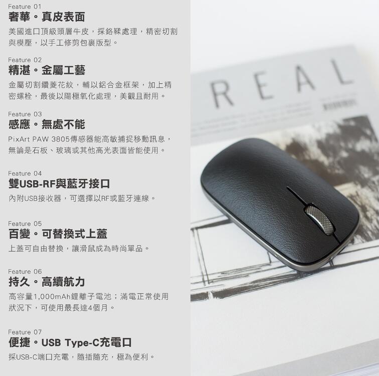 AZIO RETRO R.C.M. 復古真牛皮無線藍牙滑鼠,以頂級真皮作為用材,富有觸感,配搭著對比撞色的鋁合金框架。同時採用業界高規PixArt PAW 3805感應器,可適用於多樣化的表面紋理。