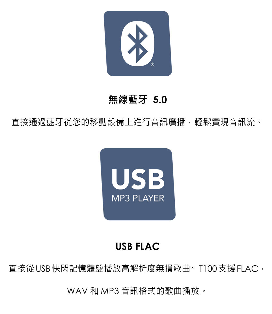 - USB FLAC:支持FLAC,WAV 和MP3 音頻格式歌曲播放,可直接從USB播放高解析無損歌曲