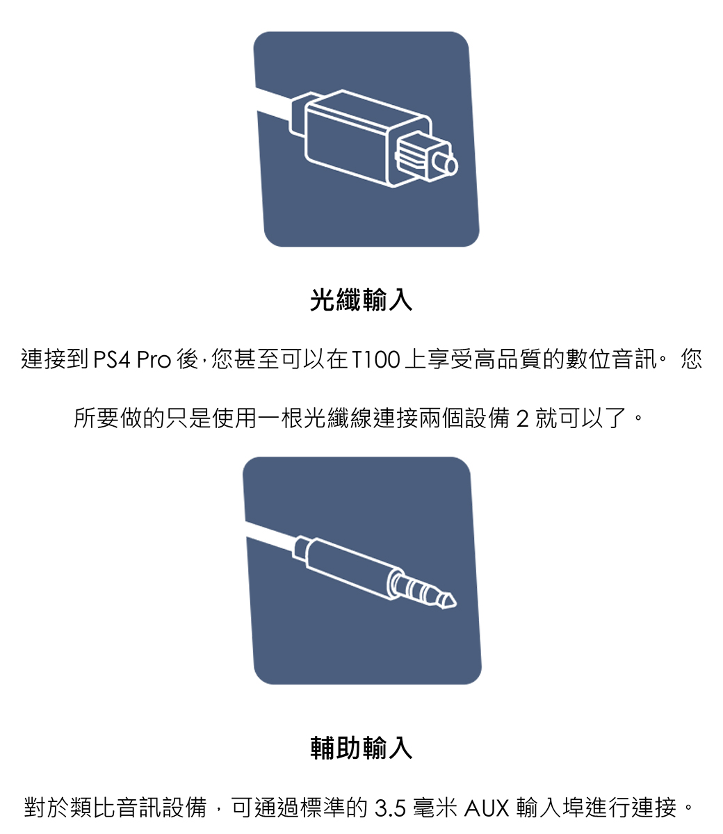 - 光纖輸入:光纖連接到PS4 後,可在Creative T100 上享受高品質數字音頻(不附帶光纖線)