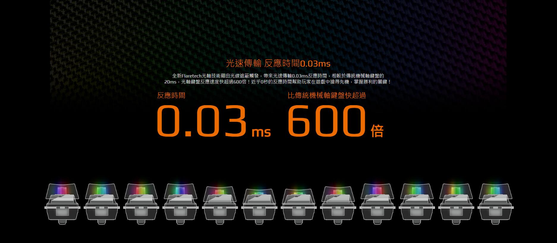 全新Flaretech光軸技術藉由光線遮蔽觸發,帶來光速傳輸0.03ms反應時間,相較於傳統機械軸鍵盤的20ms,光軸鍵盤反應速度快超過600倍!近乎0秒的反應時間幫助玩家在遊戲中搶得先機,掌握勝利的關鍵!